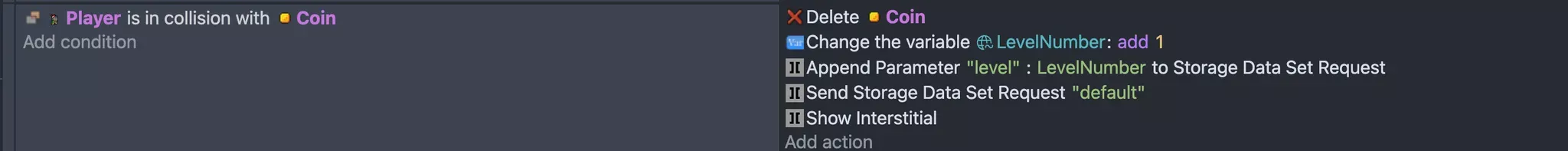 In the example above, we followed a similar approach to setting the data, but this time we used the Append Parameter to Storage Data Get Request method along with the On Storage Data Get Request Completed condition. We also checked for the existence of the level key in the response to ensure it can be assigned to our global variable, LevelNumber.