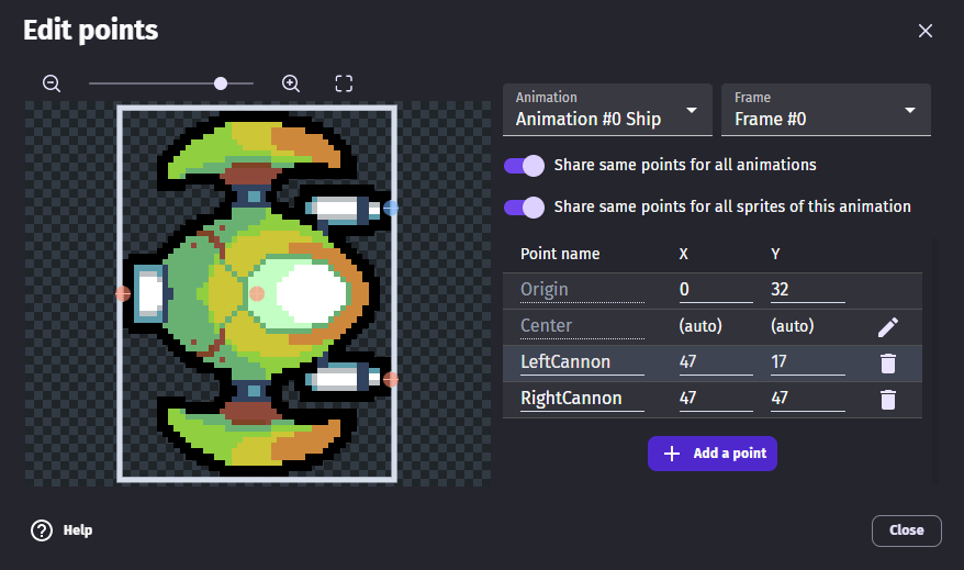 Points are reference locations that refer to a specific location around a sprite. Every sprite starts with two default points, named "Origin" and "Center". Each of these points can be moved from their default locations.