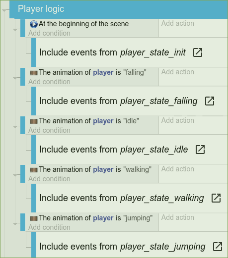 So let's get started by downloading the assets from the “” tutorial. Create a player as a “platformer object” and some platforms (“platform” behavior) to walk and jump on as described in the above-mentioned tutorial. Open the properties of the player object and create the animations “idle”, "walking","jumping" and "falling". Then create a string variable on the player object and call it “direction” with the value “right”. Switch to the event editor (“main” scene) and create these external events “playerstateinit”, “playerstatefalling”, “playerstateidle”, “playerstatewalking”, “playerstatejumping”. In the events of your main scene create a new event group from the drop-down menu on the right-hand side. Name it “Player logic”. Now add a "At the beginning of the scene" condition. Add a sub-event to the condition and link in the external event sheet “playerstateinit” via the “add”/”other” button. Do the same for all the other player states.
